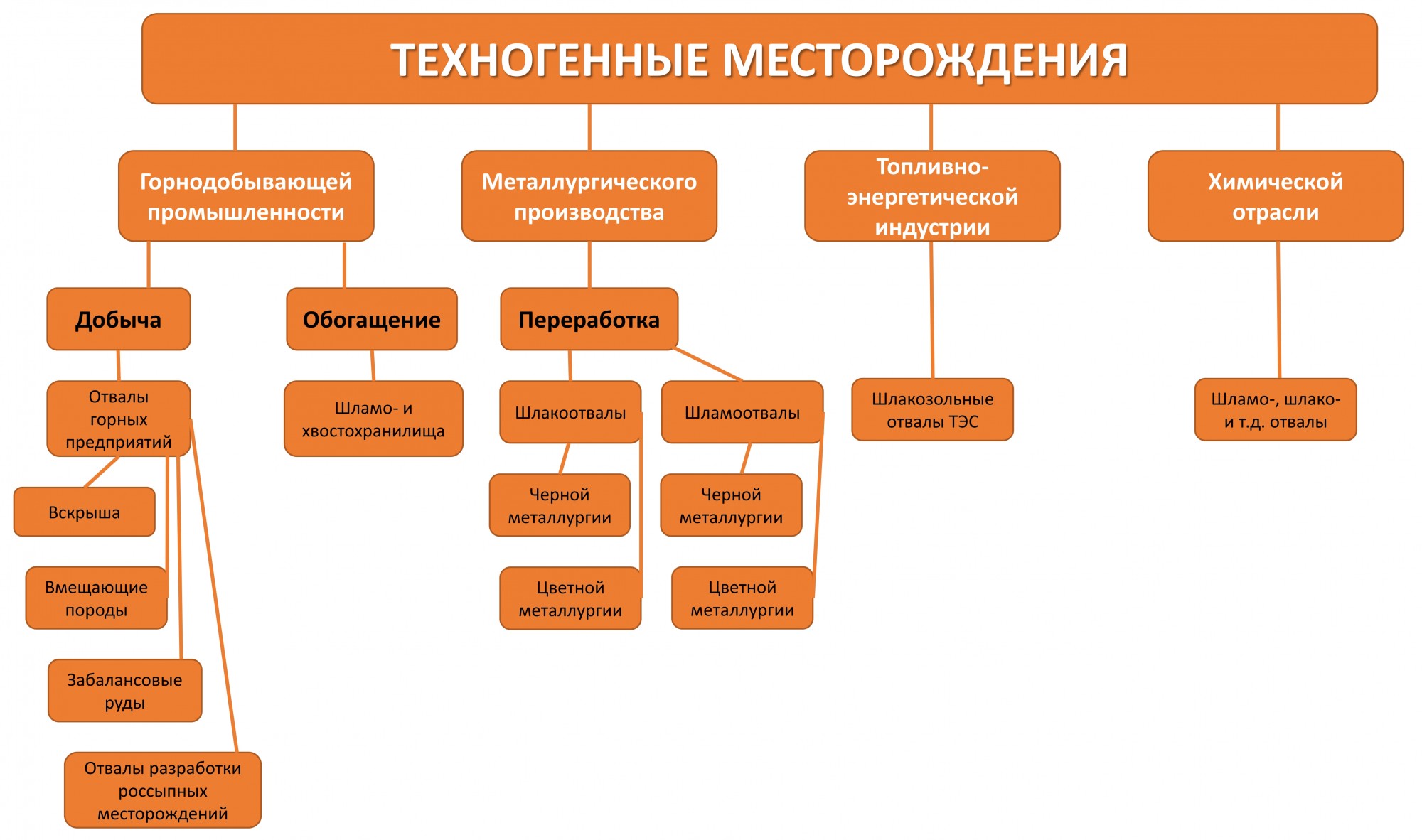 Появившиеся в последние десятилетия техногенные месторождения являются результатом интенсивного развития горнодобывающей и перерабатывающей промышленности. Техногенные месторождения представляют собой класс месторождений, сформировавшихся в районах горнорудной промышленности (Украина, Казахстан, Северо-запад и Юго-восток европейской части Росси, Урал, Юго-восток и Восток азиатской части, Центр Сибири и др.). Эти месторождения обычно обладают своеобразным минеральным составом и являются потенциальным источником разнообразных полезных ископаемых, в частности цветных, редких и благородных металлов, а также строительных материалов (щебень, песок, гравий и т.д.).